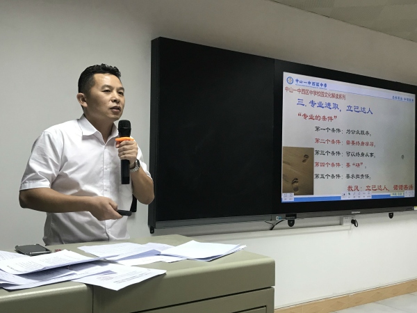 會議上,陳副校長首先明確了“志存高遠,立德樹人”主題教育目標要求。百年大計,教育為本;教育大計,教師為本;教師大計,師德為本。陳偉副校長結合校園文化解讀 “志存高遠、立德樹人”,告訴全體教師要志存高遠,要把中山一中西區(qū)中學打造成具有民族情懷和國際視野的品牌學校,教師要有“激活潛質(zhì)、自主創(chuàng)新”的育人理念,因為教好一個學生幸福一個家庭家庭,辦好一所學校造福一方社會。教師要讓自己不斷優(yōu)秀,教師應該是學生眼中最努力的那個人,努力工作是良心、責任,每位老師都是學校的形象代言人。希望中山一中西區(qū)中學的教師做明德(高貴)、日新、至善的人。全體教師一起把中山一中西區(qū)中學建設成有人性、有溫度、有故事、有美感的學校。陳副校長還告訴大家教師職業(yè)具有專業(yè)性,專業(yè)的五個條件就是:為公眾服務、終身學習、終身從事、“研”、承擔責任。