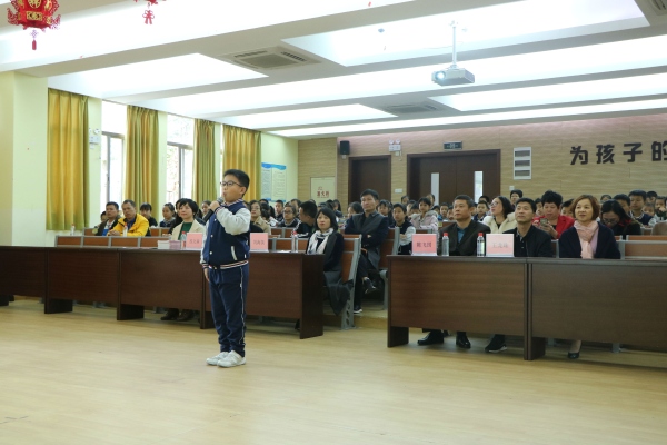 活動開始前,全場兩百多人津津有味地欣賞了鐵城小學舉辦的國防教育班會課、手抄報、主題親子活動等精彩照片,在場的領導嘉賓對鐵小舉辦的各類活動頻頻點贊。三點半,活動在鐵城小學張文君副校長的主持下正式開始。首先,由六(3)班學生代表劉楚銘發(fā)言,他號召同學們從身邊的小事做起,熱愛學習、強健體魄,樹愛國之心,立報國之志,心懷強國夢。接著,由老師代表袁軍作題為《少年智則國智,少年強則國強》的主題發(fā)言。袁老師回顧中國開展國防教育的源遠歷史,強調“國不富則無稱雄之本,兵不強則無爭霸之力”的政治主張,并從毛主席、周總理、祖逖、司馬光等名人從小立志報國為例,引用梁啟超的名句“少年智則國智,少年富則國富,少年強則國強”,勉勵全體學生努力學習科學文化知識,走高科技強國之路,用熱血筑起一道堅固的國防。接下來,由李嘉俊帶全體同學一起朗誦《少年中國說》節(jié)選,同學們激情滿滿,用鏗鏘有力的朗誦表達報效祖國的堅定決心,充分展示了國防教育的感染力、滲透力。