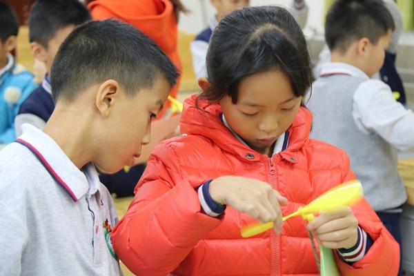 據(jù)了解,該校本次科技節(jié)活動(dòng)豐富多彩,學(xué)生參與度非常高。其中一二年級(jí)同學(xué)參與的項(xiàng)目是橡皮筋動(dòng)力直升機(jī)競(jìng)賽和創(chuàng)意花盆小制作。活動(dòng)中,一二年級(jí)小朋友們利用科學(xué)課堂展開(kāi)了橡皮筋動(dòng)力直升機(jī)的認(rèn)識(shí)、制作、試飛活動(dòng),學(xué)生對(duì)研究如何提高橡皮筋動(dòng)力直升機(jī)飛行的高度和留空時(shí)間表現(xiàn)出了極高的探究的熱情,有良好的放飛體驗(yàn)。