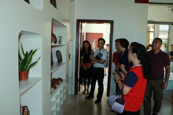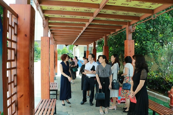 會議結束后,與會嘉賓一行近150人來到鐵城小學參觀,該校侯潔校長、張文君副校長及全體行政參與接待。當天,他們首先參觀了校園環(huán)境,在星空廊、厚德廊、鳳凰樹下的小舞臺、悅讀館等地駐足觀看。該校優(yōu)美的環(huán)境深深吸引了大家的注意力,他們紛紛駐足拍照留影。隨后,各位嘉賓還走進了該校的書法室、美術室、手工室、音樂室、舞蹈室、合唱室、管弦樂室等實地參觀,深入體驗和感受學校的辦學理念和課程特色。