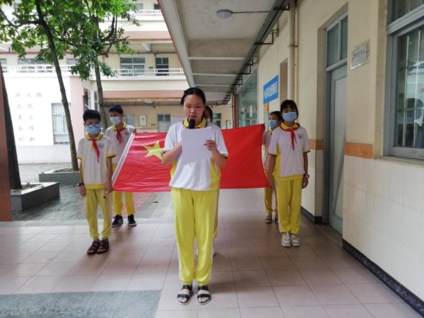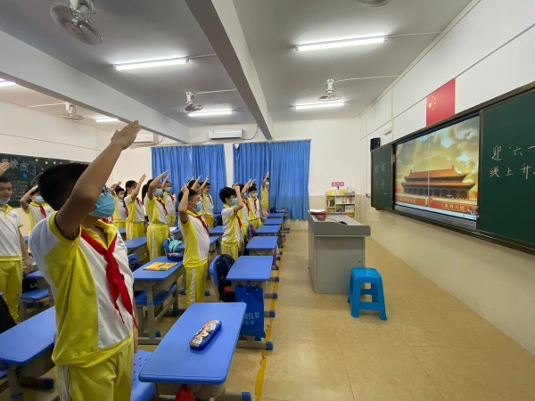 隨后,下起了細(xì)細(xì)小雨,升旗儀式改在課室進(jìn)行。適逢“六一”“兒童節(jié)將至,本次線上升旗儀式特以“致敬,少年——迎'六一'國(guó)際兒童節(jié)”為主題,滿滿的儀式感讓剛剛復(fù)學(xué)的學(xué)生們熱血澎湃,開(kāi)心不已。伴隨著國(guó)歌的響起,同學(xué)們高高舉起右手敬禮,歡快的歌聲從一間間課室傳出來(lái),表達(dá)了心中的喜悅感。