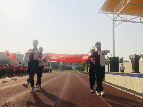 8時整,同學們身著統(tǒng)一的校服,佩戴紅領(lǐng)巾,排著整齊的隊伍走進操場。伴著激昂的出旗樂曲,小小的護旗手們,托舉著國旗,邁著矯健的步伐,雄赳赳氣昂昂地將國旗護到主席臺?!读x勇軍進行曲》在操場上空響起,全體少先隊員齊唱國歌、行隊禮。鮮艷的五星紅旗徐徐升起、迎風飄揚,昭示著聚星學校的孩子們在幸福的時代里健康快樂地成長。