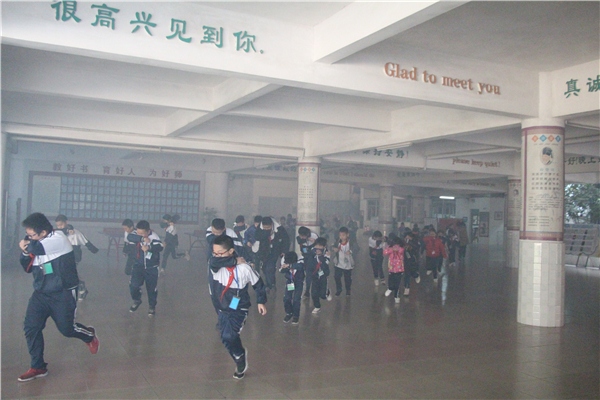 8點(diǎn)55分,校園內(nèi)響起消防警報(bào)聲,全校3000多名師生在安全引導(dǎo)員的組織下,從教室前后門(mén)分別快速、在走廊集隊(duì),并按計(jì)劃分班級(jí)迅速下樓梯到操場(chǎng)集合。在隊(duì)伍行進(jìn)中,同學(xué)們都能把老師傳授的逃生知識(shí)應(yīng)用到演練中,彎腰、低頭、捂鼻等動(dòng)作都做得非常規(guī)范到位。本次演練使用了消防專用煙霧彈,逃生現(xiàn)場(chǎng)出現(xiàn)了大量黃色煙霧,增加了逼真的火災(zāi)情形。7分鐘后,全校師生都安全到達(dá)操場(chǎng)的指定位置。在預(yù)定的時(shí)間內(nèi)完成了逃生演習(xí),速度較快,隊(duì)形隊(duì)列整齊劃一,逃生時(shí)的身體姿勢(shì)規(guī)范到位,各班級(jí)輔導(dǎo)員老師指揮得力。到達(dá)操場(chǎng)后,同學(xué)們雙手護(hù)頭蹲下,安靜的等候指令。