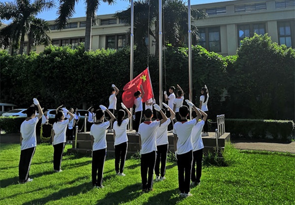 在強勁有力的鼓樂聲中,鼓號隊的同學們步入操場。他們颯爽的英姿、整齊的步伐、嘹亮的號聲、清晰的鼓點將全場的氣氛瞬間點燃,充分展示出中山市新長江學子朝氣蓬勃、積極向上的精神風貌。在莊嚴肅穆的國歌聲中,升旗手們將五星紅旗冉冉升起,肅然而立的師生們隨著樂曲高唱國歌。