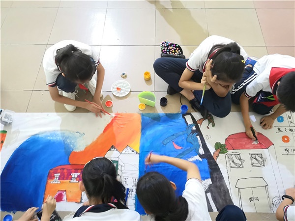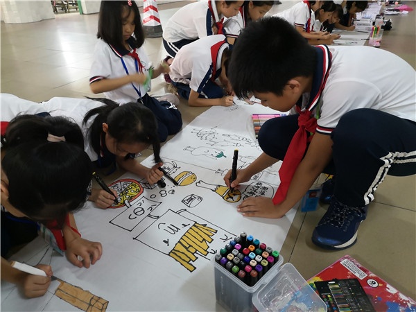 1點40分,活動正式開始,百米長卷一地鋪開,170多名小畫家或蹲、或趴,或席地而坐,手握五彩的畫筆,所畫體裁多樣,兒童畫、油棒畫、水彩畫、水粉畫等都出現(xiàn)在花卷上。他們年紀雖小,但技巧熟練,在勾勒出的框架中開始在畫卷上輕描淡寫:描繪、調(diào)色、渲染,每個步驟一氣呵成,色彩使用大膽,層次分明,學(xué)生們雖然畫姿各異,但是那份認真與專注卻又十分統(tǒng)一,快樂的笑容、張揚的姿態(tài),此次活動經(jīng)歷必然成為他們寶貴的回憶。
