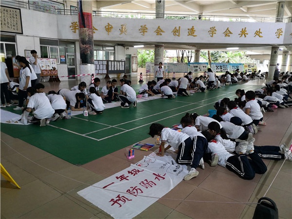 在繪畫場上,能看到學(xué)校根據(jù)安全教育的主題,把畫卷分了7個不同的安全主題,而參賽對象分別是一至八年級學(xué)生,他們每班選派了3名繪畫水平最高的學(xué)生為代表參加比賽,共同完成一幅100M*70CM的作品。創(chuàng)作主題各年級不同,其中一年級為《預(yù)防溺水》,二年級《交通安全》,三年級《食品安全》,四年級《預(yù)防火災(zāi)》,五年級《防自然災(zāi)害》,六年級《校園欺凌》,七八年級《毒品危害》。