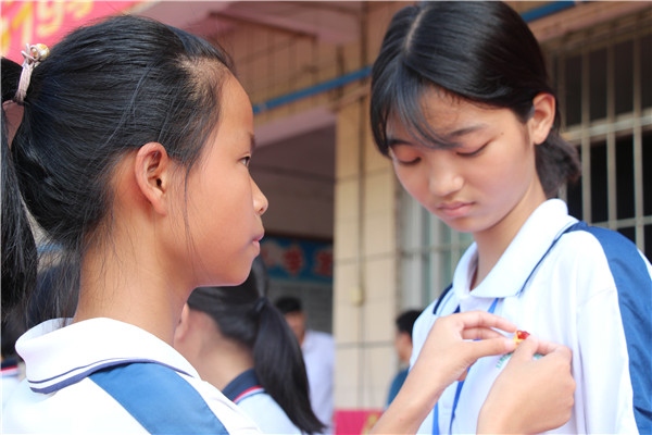 團委副書記彭東梅宣讀團組織關(guān)于同意曾燁毅等12名同學(xué)入團的決定,在莊嚴的宣誓流程中,學(xué)校團委書記譚嘉勇帶領(lǐng)12名新團員進行入團宣誓,團委所有成員進行誓詞回顧,他們鄭重的舉起右拳,向著團旗莊嚴宣誓,鏗鏘的誓詞,豪壯的誓言,激勵著在場的每位學(xué)生。接著由12名老團員為新團員頒發(fā)團章,團員證以及佩戴團徽,