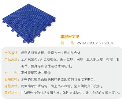與硬質(zhì)地面相比,拼裝地板具有良好的安全性、減震性和反彈力,很好地實(shí)現(xiàn)垂直吸震及能量回送,側(cè)向緩沖,防滑,防運(yùn)動(dòng)損傷,有效保護(hù)運(yùn)動(dòng)者的運(yùn)動(dòng)安全,充分發(fā)揮人體運(yùn)動(dòng)潛能。采用原料聚丙稀(PP)為高強(qiáng)度材料,無(wú)毒環(huán)保。