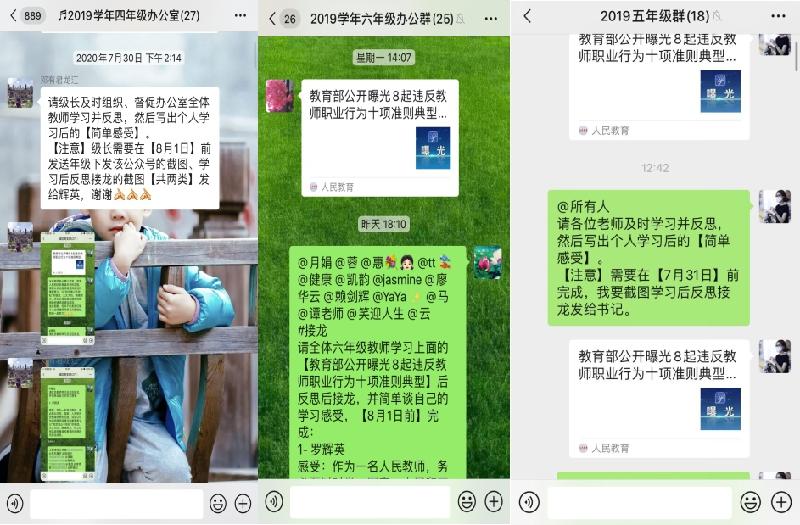 “師者,以德為先”。高尚的師德師風(fēng)是教師從事教育工作的靈魂。為了進(jìn)一步加強(qiáng)教師隊(duì)伍建設(shè),不斷提高教師職業(yè)道德素質(zhì)和師德修養(yǎng),保障全體教師在良好師德師風(fēng)塑造和學(xué)習(xí)中的不松懈和持續(xù)性,7月27日-30日,在暑假期間,龍江城區(qū)中心小學(xué)組織全體教師在線上重點(diǎn)學(xué)習(xí)了“教育部公開曝光8起違反教師職業(yè)行為十項(xiàng)準(zhǔn)則典型問題”一文,并進(jìn)行了自我反思和學(xué)習(xí)心得的分享交流。