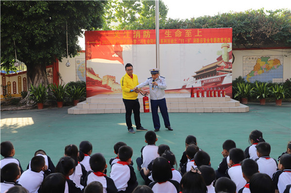 下午四點鐘,警報再次響起。全校師生按照方案路線,彎腰捂口鼻,有序迅速聚攏到升旗臺前。升旗臺上早已經(jīng)擺好了演練道具:煤氣罐、滅火器。在學生們熱烈的掌聲中,陳村鎮(zhèn)專職消防隊防火員、梁釗林紀念小學消防校長劉國興緩步走上升旗臺,儒雅地給全體師生行了禮之后給同學們介紹相關(guān)的消防安全知識。接下來,劉國興校長親自給師生們示范如何滅火。劉校長右手握著火把,左手擰開煤氣罐,迅速點燃煤氣,熊熊大火呼嘯而出,學生們都為之提心吊膽,都屏息凝視。劉校長不慌不忙,左手緊握滅火器手柄,右手拔下掛鉤,一邊摁下閥門,一邊提起虹吸管對準火苗掃噴。火苗立刻給滅掉,劉校長緊接著關(guān)緊煤氣罐的氣閥,煤氣呼呼的噴涌聲也給遏制了。學生們情不自禁、不約而同響起了贊美的掌聲。接下來,保安、清潔工、老師、學生代表都輪流參與了滅火。他們從實操中掌握了如何用滅火器滅火。學生們都喜歡這樣別開生面的演練活動,他們把頭抬得高高的,生怕看漏了演練里的一些內(nèi)容。