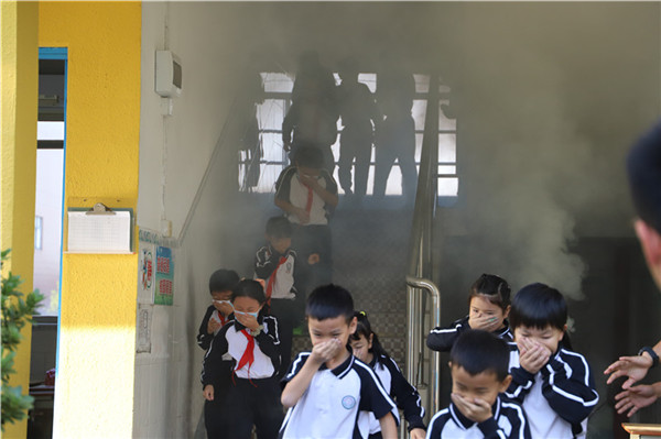 十三點整,警報聲響徹校園,濃煙滾涌而來,學生們按照地上箭頭方向,迅速從防火通道口撤離。學生們一個個神情肅穆,捂住口鼻,迅速而有序的從通道口撤離險情現(xiàn)場。樓內(nèi)疏散人員按照預先的消防演習方案疏散學生,保證在樓內(nèi)學生的安全,以免慌亂中出現(xiàn)擁擠或者踩傷學生事故。學生們逃生到一樓之后,就排成方隊。隨后區(qū)祥海校長和黃主任都做了總結(jié)。區(qū)校長通過介紹日本的逃生素養(yǎng)和南海區(qū)平洲鎮(zhèn)的火災案例教育學生們重視演練、認真學習逃生要領,珍愛生命。