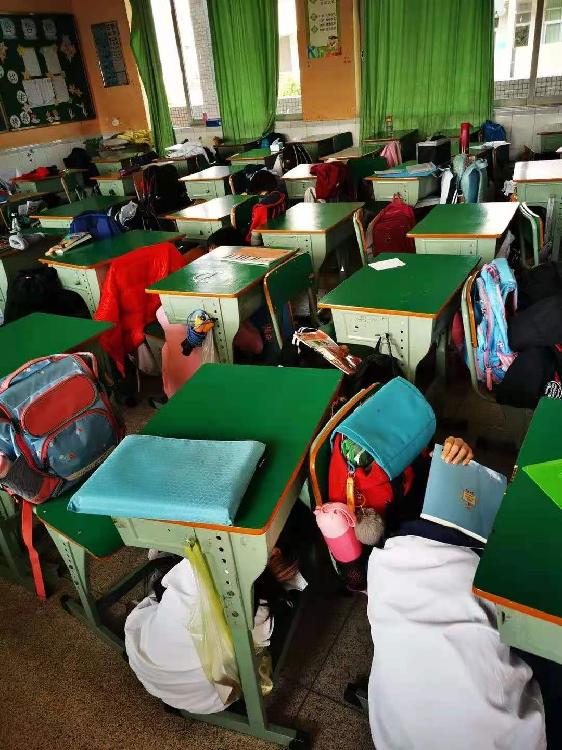地震正在發(fā)生,學(xué)生迅速就近躲避。
