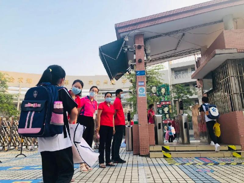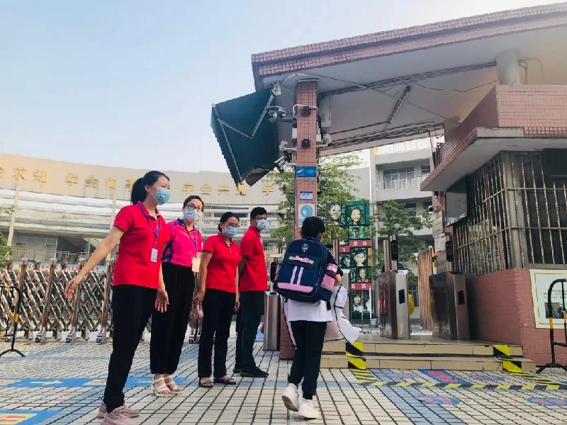 廖校長(zhǎng)帶領(lǐng)行政們、值日老師和家長(zhǎng)義工在校門口用最美的微笑和親切的問候迎接一張張可愛的笑臉。學(xué)生們興高采烈地、滿懷期待地進(jìn)入校園。瞧,多想快些見到老師和同學(xué)們,簡(jiǎn)直是健步如飛呀!