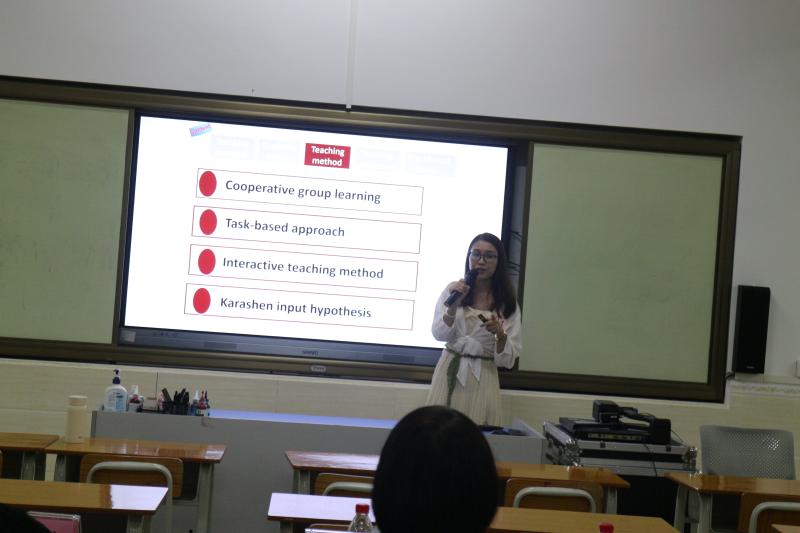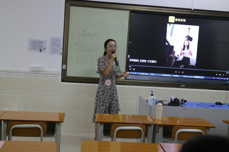 第二環(huán)節(jié)是選手按抽簽順序進(jìn)行才藝展示及演講比賽。每位選手首先播放錄制的才藝視頻或者進(jìn)行現(xiàn)場(chǎng)三分鐘才藝展示,然后按照抽簽的題目進(jìn)行三分鐘英文演講。才藝展示中,選手們“各顯神通”,從唱歌到鋼琴?gòu)棾瑥亩桃曨l配音到拍攝趣味教學(xué)視頻,從現(xiàn)場(chǎng)微課再到錄課展示……可謂讓人大開(kāi)眼界,嘆為觀(guān)止。演講環(huán)節(jié)中,各位青年教師結(jié)合自身經(jīng)歷,紛紛闡述個(gè)人觀(guān)點(diǎn),讓人印象深刻。