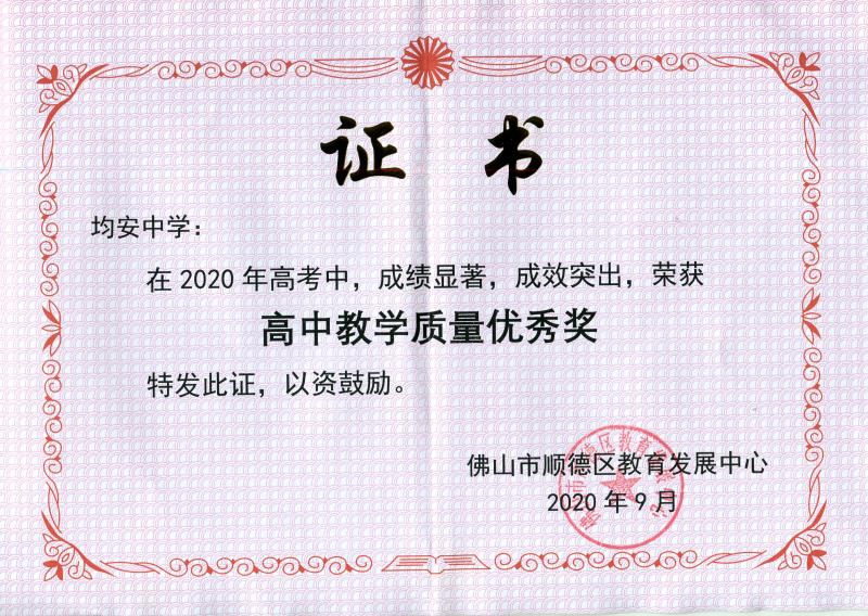 均安中學(xué)榮獲“2020年高中教學(xué)質(zhì)量?jī)?yōu)秀獎(jiǎng)”!