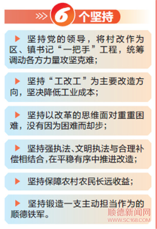 一是堅持黨的領(lǐng)導(dǎo),將村改作為區(qū)、鎮(zhèn)書記“一把手”工程,統(tǒng)籌調(diào)動各方力量攻堅克難。順德明確村改是區(qū)、鎮(zhèn)書記“一把手”工程,建立“一把手”負(fù)總責(zé)的機(jī)制,如果哪個鎮(zhèn)街推進(jìn)不力,首先問責(zé)鎮(zhèn)街書記。同時,調(diào)動方方面面的資源和力量集中攻堅村改。在組織上,把村改主戰(zhàn)場作為培養(yǎng)、歷練、考察、使用干部的大舞臺,樹立起明確的用人導(dǎo)向;在宣傳上,報道頭版永遠(yuǎn)留給村改工作、村改人;在執(zhí)法上,聚合全區(qū)所有執(zhí)法力量依法強(qiáng)執(zhí)法,等等。同時,堅持不設(shè)試點,十個鎮(zhèn)街十大軍團(tuán)同時進(jìn)發(fā),形成了你追我趕,相互競爭、相互學(xué)習(xí)的生動局面,營造出了村改勢不可擋的氛圍。