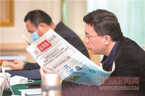 與會人員閱讀《珠江商報》刊發(fā)的順德區(qū)村級工業(yè)園改造專題內(nèi)容。