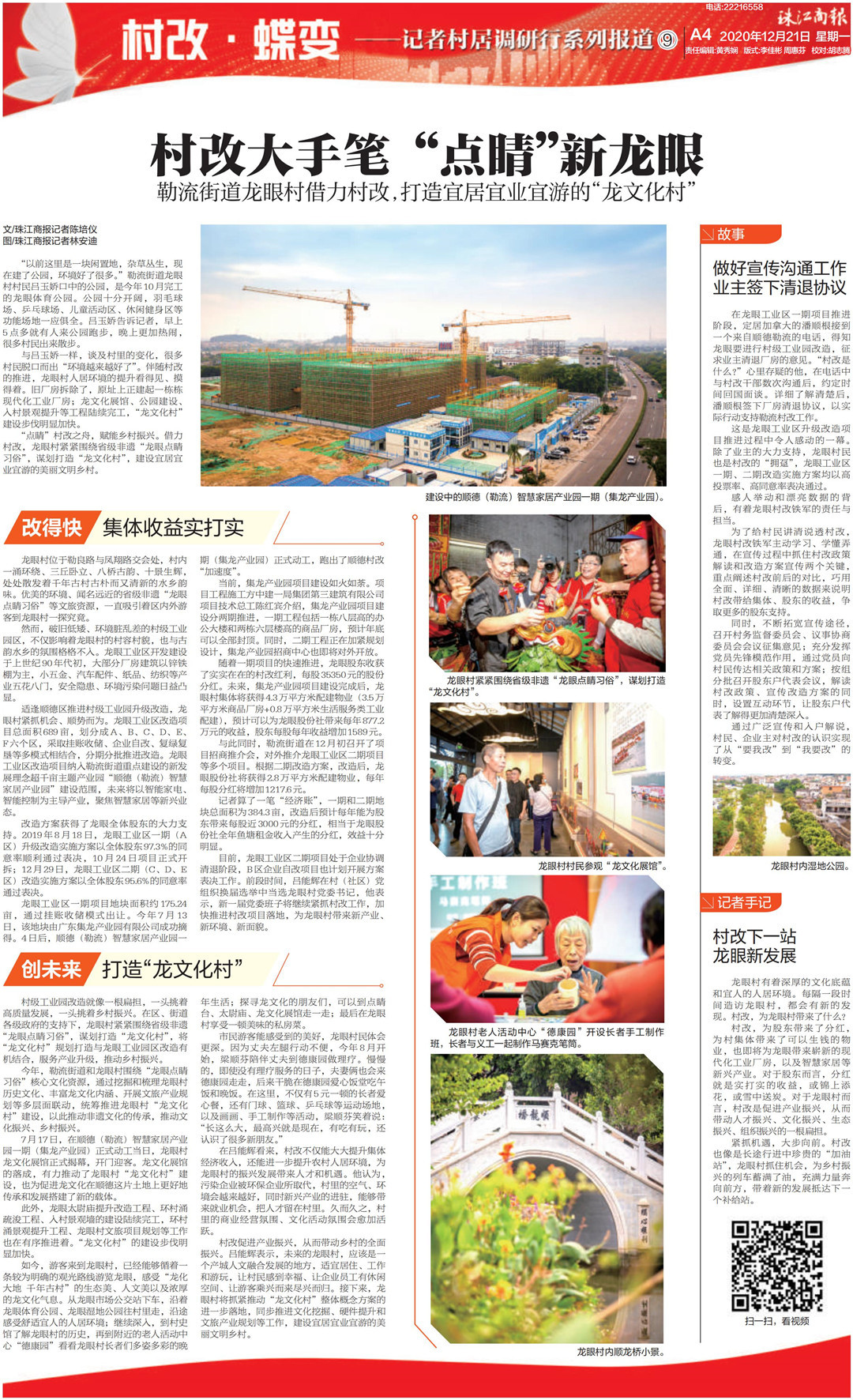 與呂玉嬌一樣,談及村里的變化,很多村民脫口而出“環(huán)境越來越好了”。伴隨村改的推進(jìn),龍眼村人居環(huán)境的提升看得見、摸得著。舊廠房拆除了,原址上正建起一棟棟現(xiàn)代化工業(yè)廠房;龍文化展館、公園建設(shè)、入村景觀提升等工程陸續(xù)完工,“龍文化村”建設(shè)步伐明顯加快。