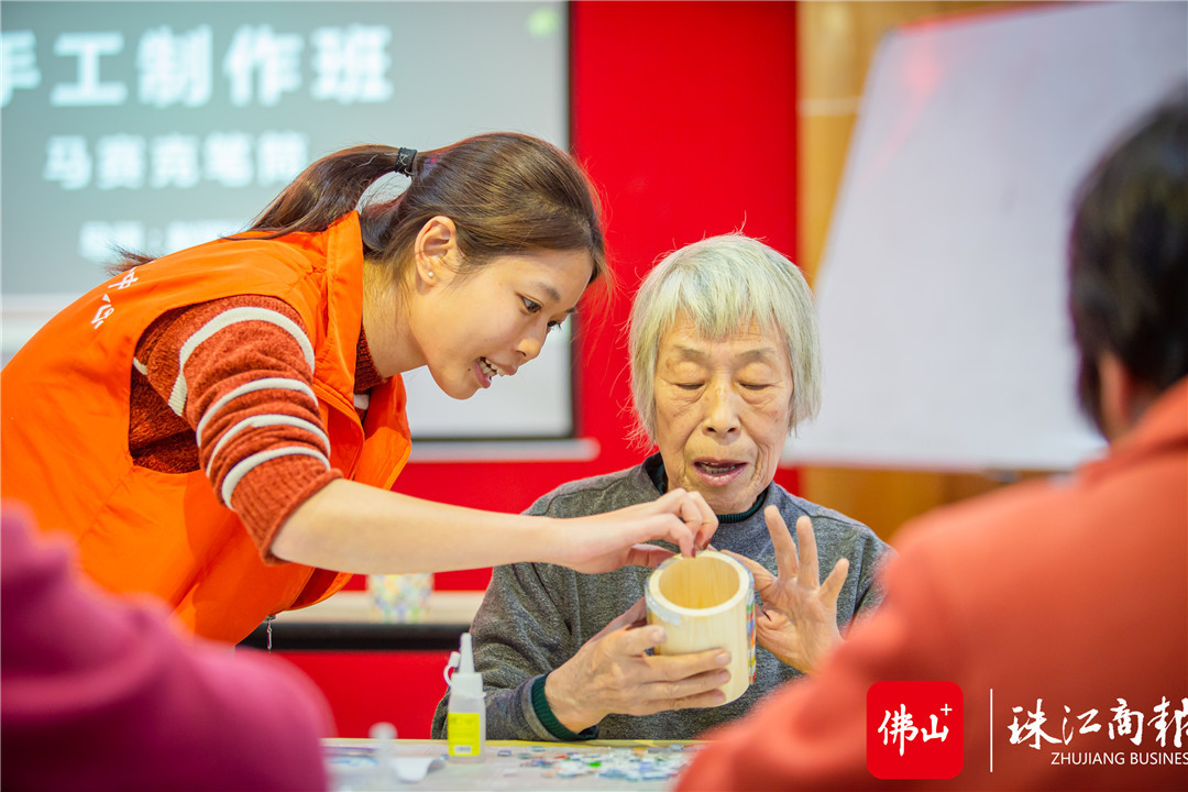 龍眼村老人活動中心“德康園”開設(shè)長者手工制作 班,長者與義工一起制作馬賽克筆筒。