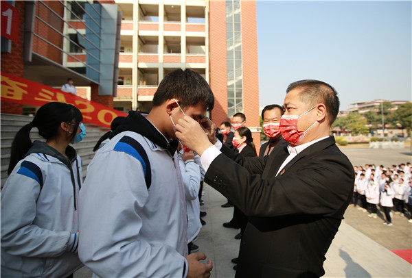 傳遞能量,牛氣沖天。全體學(xué)校行政為各班學(xué)生代表送上“牛氣沖天”的紅口罩,并把巧妙地融合了各班班主任名字的祝福車牌贈送給各班的班主任,再次為學(xué)子們送上濃濃的祝福。