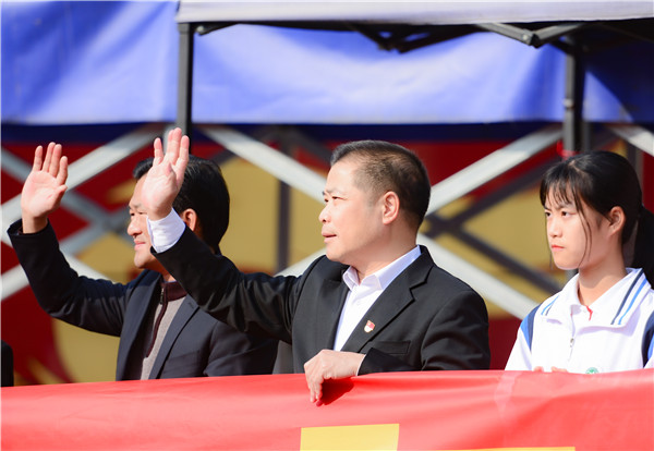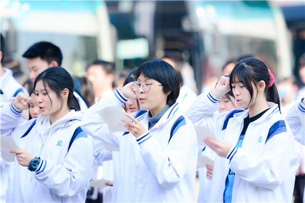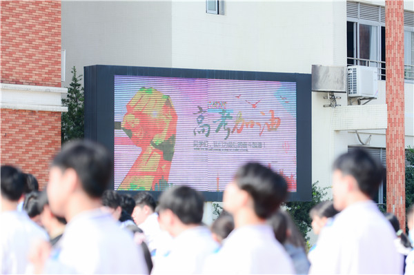 隊(duì)列整齊,旌旗飄揚(yáng),伴隨著歌曲《奔赴考場》,高考壯行儀式拉開了序幕。