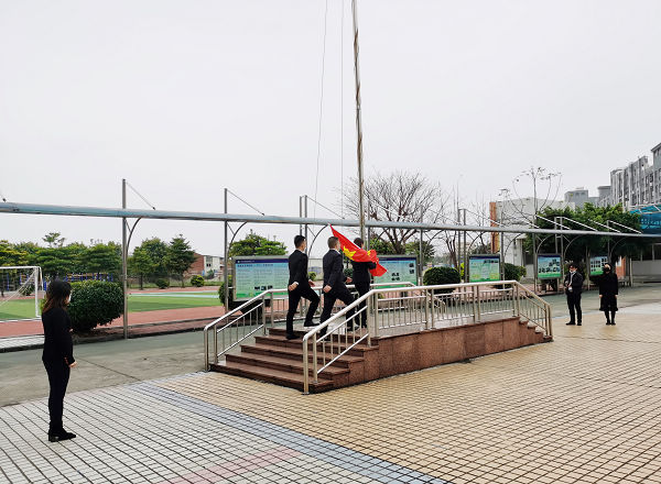 空曠的操場上,莊重如常。張永新校長和行政團(tuán)隊分別擔(dān)任本次儀式的升旗手和護(hù)旗手,步伐整齊劃一。