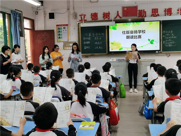 本次比賽以班級(jí)為單位,結(jié)合全班指定內(nèi)容朗讀、現(xiàn)場(chǎng)抽選內(nèi)容朗讀、指定學(xué)生朗讀、現(xiàn)場(chǎng)抽選學(xué)生朗讀的形式進(jìn)行抽查比賽。同時(shí)考量各班帶讀學(xué)生的組織管理能力,全班學(xué)生的朗讀姿勢(shì)等因素,評(píng)委當(dāng)場(chǎng)打分。比賽現(xiàn)場(chǎng)氣氛熱烈,同學(xué)們個(gè)個(gè)精神飽滿,熱情洋溢。