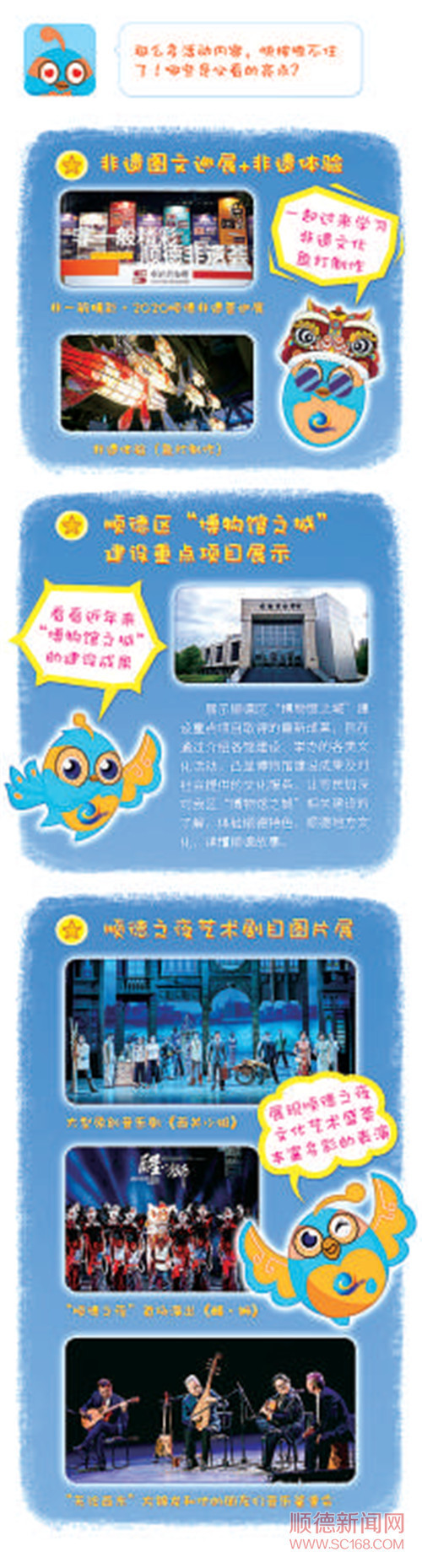 據(jù)介紹,創(chuàng)意閱讀節(jié)展示區(qū)劃分為三個區(qū)域:順德區(qū)博物館將舉辦非一般精彩·2020順德非遺薈巡展、順德區(qū)“博物館之城”建設重點項目展示、非遺體驗項目(做魚燈);順德區(qū)清暉園博物館設置清暉園特色景觀留影區(qū),還將進行答題有禮環(huán)節(jié);順德區(qū)文化藝術發(fā)展中心舉辦街舞、手鼓、傳統(tǒng)舞蹈表演,并展示2020年順德之夜文化藝術盛薈劇目。晚上8點在展示區(qū)還將進行亮燈儀式,從博物館的魚燈區(qū)一直延伸到主舞臺。
