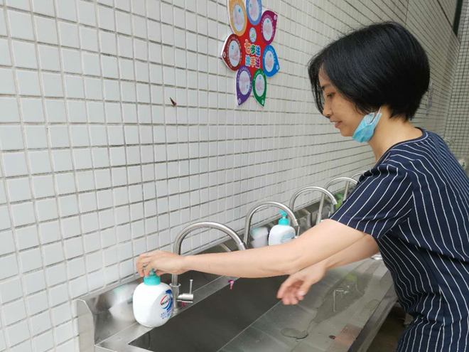 后勤人員對大堂、樓梯、走廊、洗手池等進行清潔消毒
