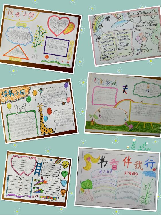 在閱讀活動(dòng)的初始階段做閱讀小報(bào),不能要求太嚴(yán)或限制太多,多給予更多的自由發(fā)揮的空間和適當(dāng)?shù)碾S意性。例如可以是內(nèi)容上的記錄、閱讀的心得體會(huì)、好詞好句摘抄、積累閱讀的名言名句等,再配上圖,文字做到工整。我們的初衷就是希望全體孩子都去閱讀,而不能讓我們的要求過(guò)高使得那些表達(dá)能力感悟能力差,繪畫(huà)或書(shū)寫(xiě)能力差的孩子有壓力因而降低了閱讀的熱情和愿望。