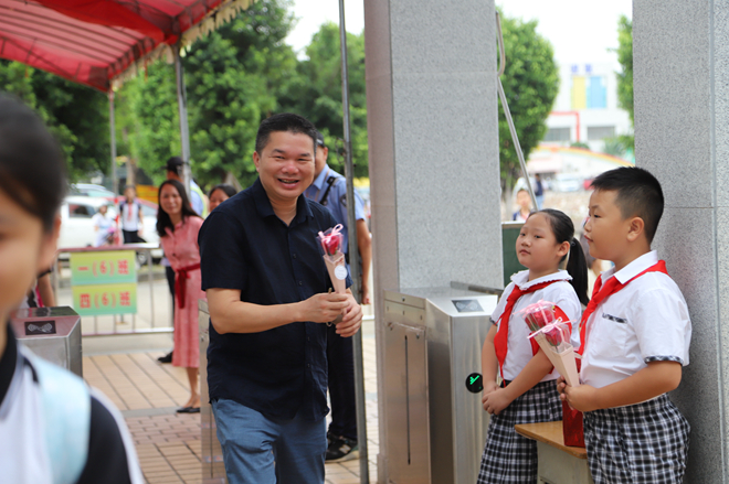 9月10日早上,少先隊(duì)隊(duì)員代表們手捧鮮花列隊(duì)為教師們送花。一朵鮮花,一個(gè)微笑,一份感恩,就這樣在華東小學(xué)校門口傳遞著。