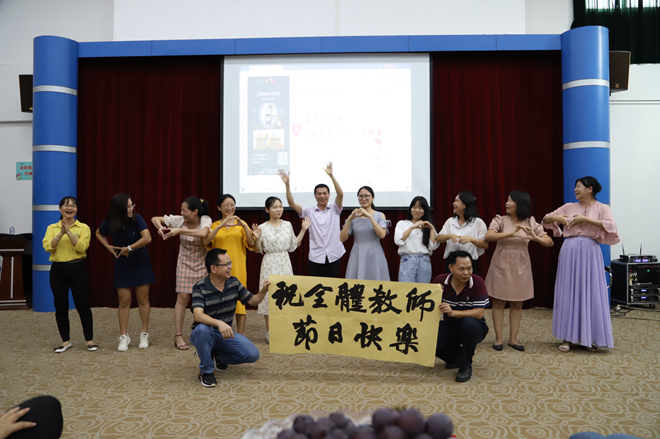 9月10日下午,全體教師聚集學(xué)校階梯式,進(jìn)行了短暫的慶祝教師節(jié)活動。簡單的下午茶,臨時(shí)排練的小節(jié)目,讓現(xiàn)場到處都洋溢著幸福、快樂的節(jié)日氣息!