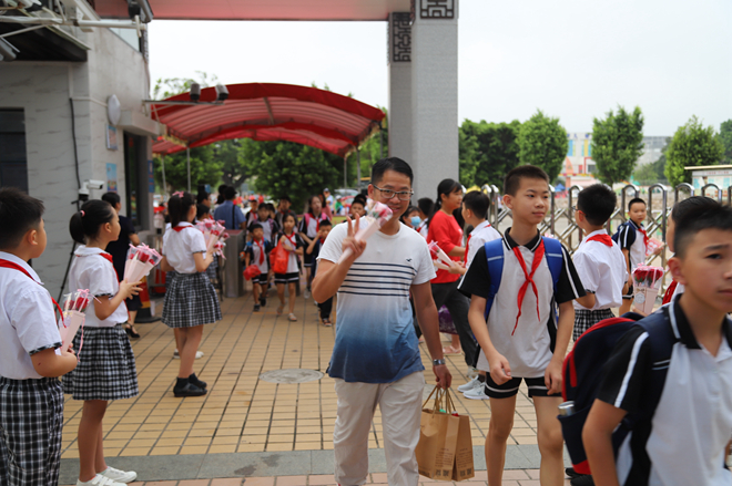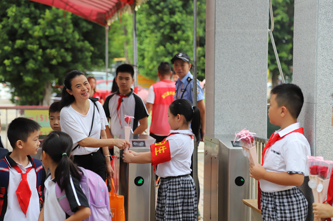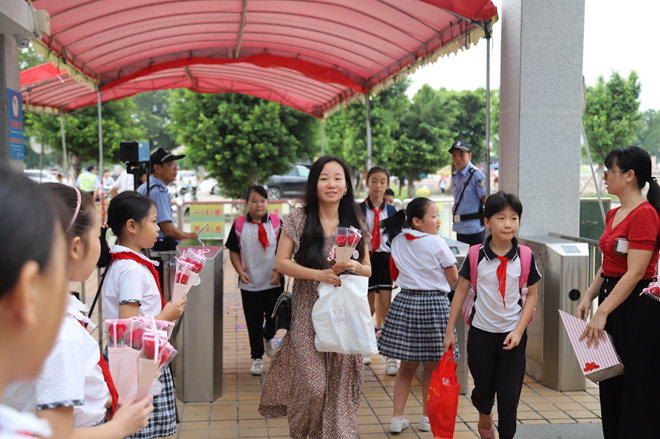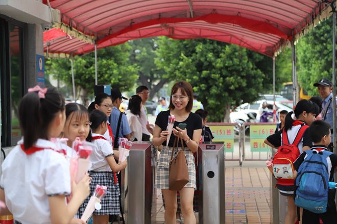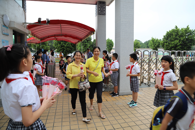 9月10日早上,少先隊(duì)隊(duì)員代表們手捧鮮花列隊(duì)為教師們送花。一朵鮮花,一個(gè)微笑,一份感恩,就這樣在華東小學(xué)校門口傳遞著。