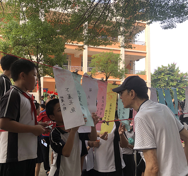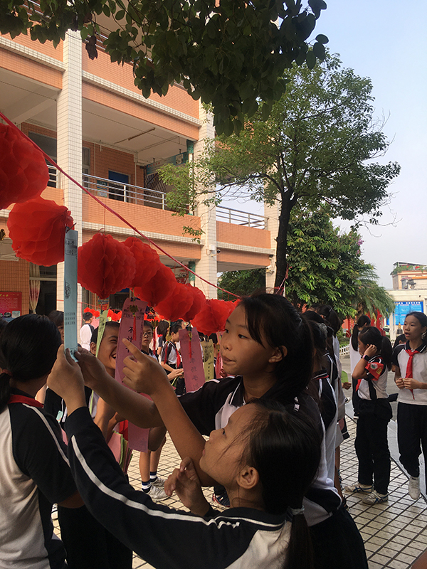 是日,秋高氣爽,紅燈籠系著謎條,在秋風(fēng)中飛舞。孩子們快樂地穿行在謎條間,或沉思,或討論,或駐足仰望……絡(luò)繹不絕。猜中了,取下謎條,興沖沖地走到兌獎區(qū),換來一顆顆甜甜的糖果。猜不中,也不泄氣,繼續(xù)思考……燈謎協(xié)會到譚沃宏老師和葉汝泉老師也一同前來,跟我們到小謎友互動,他們上那么耐心地講解,孩子們仰著腦袋,認(rèn)真聆聽著……