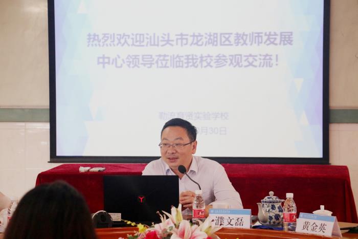 參觀完校園后,在二樓會(huì)議室開展座談會(huì),會(huì)議由吳海堅(jiān)副主任主持。會(huì)上,濮文磊校長對(duì)汕頭市龍湖區(qū)教師發(fā)展中心領(lǐng)導(dǎo)專家一行的來訪表示熱烈的歡迎。與會(huì)人員一同觀看了學(xué)校宣傳片,使他們對(duì)學(xué)校文化建設(shè)有更深的了解。濮文磊校長對(duì)學(xué)校的發(fā)展歷程、辦學(xué)理念、辦學(xué)特色以及學(xué)校一體化發(fā)展作了簡(jiǎn)要的匯報(bào)。