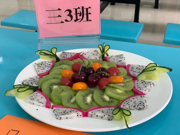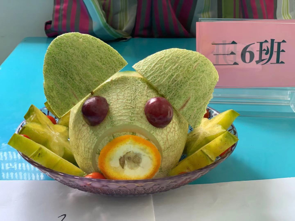 首先進(jìn)行的是“水果拼盤”比賽。每班組成一個(gè)美食小隊(duì)制作“水果拼盤”,比賽中,參賽選手們?nèi)褙炞ⅲハ嗯浜?、分工合作,力爭展示自己的?dú)特創(chuàng)意,更增添了此項(xiàng)比賽的藝術(shù)性。一個(gè)個(gè)普通的水果在同學(xué)們的靈心巧手之下變成一個(gè)個(gè)藝術(shù)品,富有詩意的拼盤名字更突顯同學(xué)們深厚的文學(xué)水平,對(duì)拼盤創(chuàng)意的精彩解說展現(xiàn)了同學(xué)們明捷的思維和伶俐的口齒。評(píng)委老師對(duì)拼盤作品嘖嘖稱嘆,對(duì)同學(xué)們的表現(xiàn)贊不絕口,活動(dòng)評(píng)選出“垂涎欲滴獎(jiǎng)”、“創(chuàng)意滿分獎(jiǎng)”、“色香俱全獎(jiǎng)”。