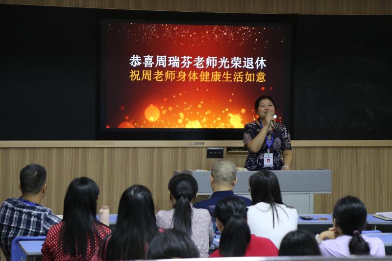 大屏幕前,幻燈片和著音樂,翻開了周老師的華美篇章,展現(xiàn)了她光輝的教育歷程。傅文芳校長發(fā)表了熱情洋溢的講話,周老師用樸實(shí)嚴(yán)謹(jǐn)?shù)娘L(fēng)格,教育了一屆又一屆學(xué)生;她用宅心仁厚的品格,影響了一批又一批教師。她兢兢業(yè)業(yè),無私奉獻(xiàn),把最美好的芳華都獻(xiàn)給了教育事業(yè)。她是我們敬重的前輩,是我們學(xué)習(xí)的榜樣!”隨后周老師深情回顧了自己工作的經(jīng)歷,并感謝學(xué)校召開如此隆重的榮休座談會(huì)。