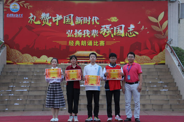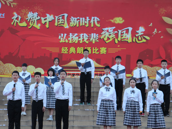 本次共有16個(gè)班級(jí)參加了比賽活動(dòng),他們熱情高漲,紛紛以自己獨(dú)特的方式演繹著國(guó)學(xué)經(jīng)典的藝術(shù)魅力,詮釋著國(guó)學(xué)經(jīng)典的作品內(nèi)涵。其中,慷慨激昂的《祖國(guó)的贊歌》;婉約柔美的《歌頌祖國(guó)》;慷慨激昂,飽含深情的《祖國(guó)啊,我親愛的祖國(guó)》,賺足了大家的眼球;“美哉,我少年中國(guó),與天不老!壯哉,我中國(guó)少年,與國(guó)無疆!”嘹亮的聲音響徹全場(chǎng),豪邁的氣勢(shì)振奮人心。《少年中國(guó)說》極力歌頌了少年的朝氣蓬勃,也體現(xiàn)出當(dāng)代當(dāng)代中國(guó)少年發(fā)奮圖強(qiáng)的風(fēng)骨!絲絲管弦,演不盡中華的流光溢彩;悠悠書生,誦不完國(guó)旗的悠揚(yáng)鏗鏘。唯美悠揚(yáng)的背景音樂、絢麗的舞臺(tái)造型、典雅的服裝設(shè)計(jì)等相關(guān)藝術(shù)輔助,給現(xiàn)場(chǎng)觀眾奉上了一場(chǎng)中華經(jīng)典詩(shī)文的視聽盛宴。比賽中,節(jié)目不拘形式,感情真摯投入,朗誦形式多樣,朗誦技巧高超,氣氛熱烈,場(chǎng)面恢宏。在他們的誦讀聲中,讓我們感受到了青春的熱情、青春火熱的理想。