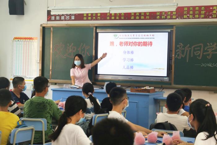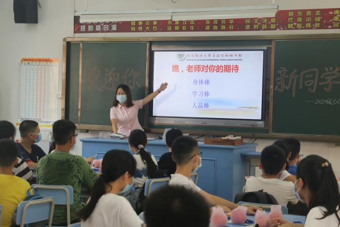 走進教室,早有正副班主任滿臉笑意的迎上來,迎面而見的是整齊的桌椅,黑板上老師們用心布置的歡迎詞。學校還精心地在每個座位上準備了蘋果,祝福學子們平安健康。