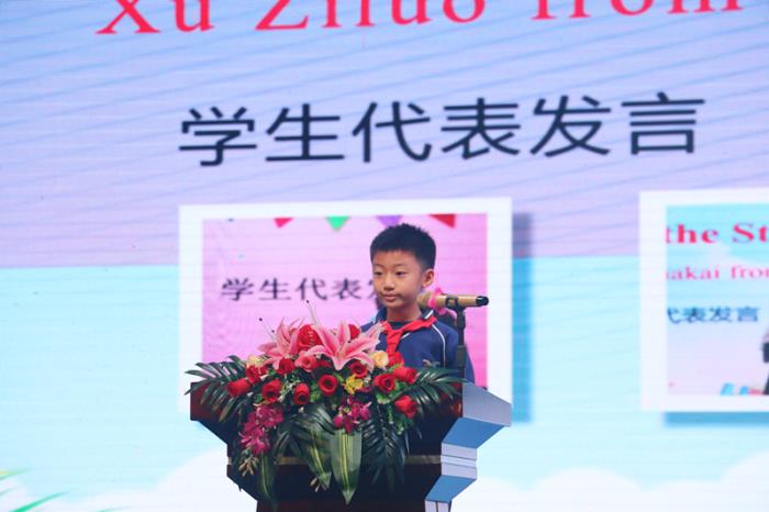 表演結(jié)束后,三年(8)班徐梓洛同學(xué)作為英語(yǔ)特色班代表發(fā)言。他用流利的英語(yǔ)跟大家分享了在本次英語(yǔ)嘉年華中的收獲以及學(xué)習(xí)英語(yǔ)的心得體會(huì),表達(dá)了對(duì)英語(yǔ)的喜愛(ài)之情,感謝學(xué)校提供的英語(yǔ)特色課程讓他的英語(yǔ)學(xué)習(xí)之路變得多姿多彩。同時(shí)他希望自己能夠帶著一口流利的英語(yǔ)環(huán)游世界與世界各地的人交朋友,向他們介紹我們國(guó)家,開(kāi)啟在英語(yǔ)世界的多彩夢(mèng)想。