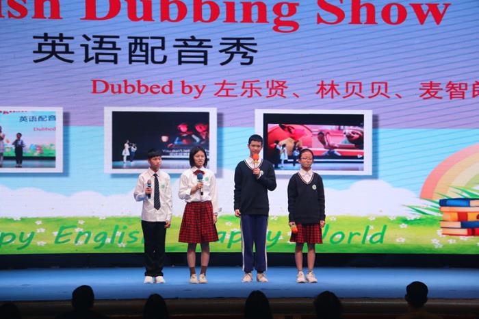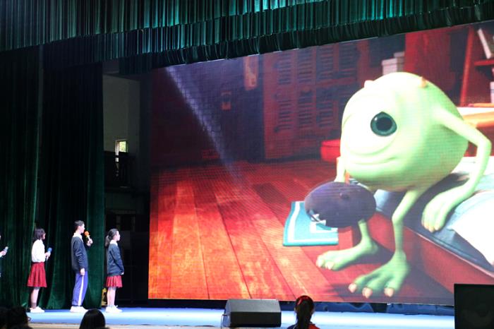 最后,初中英語(yǔ)特色班左樂(lè)賢、林貝貝、麥智朗、葉欣桐四位同學(xué)為動(dòng)畫(huà)電影《冰雪奇緣》、《怪獸公司》配音,該節(jié)目配妙趣橫生,配音演員們?cè)谂_(tái)上仿佛與角色融為了一體。他們用自己的聲音和語(yǔ)言在舞臺(tái)上精彩還原了電影中的人物性格特色,一人分飾兩角,將電影中角色的聲音模仿的活靈活現(xiàn)。嫻熟的英語(yǔ)發(fā)音、抑揚(yáng)頓挫的情感節(jié)奏,讓場(chǎng)下的觀眾們?nèi)缗R其境,掌聲不斷。