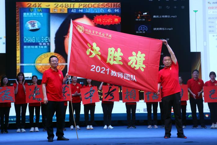 在陣陣加油聲中,濮校長(zhǎng)上臺(tái)為九年級(jí)教師團(tuán)隊(duì)頒發(fā)“決勝旗”,麥景志主任帶領(lǐng)全體九年級(jí)教師宣誓,老師們的誓詞鏗鏘有力,充滿了必勝的決心。