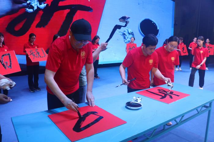 伴隨著舒緩的音樂(lè),九年級(jí)教師團(tuán)隊(duì)里的兩位書(shū)法大師――譚成老師和曾供智老師上臺(tái)即席揮毫,現(xiàn)場(chǎng)書(shū)寫(xiě)“百日競(jìng)渡,決勝中考”、“相信自己,蟾宮折桂”,為九年級(jí)全體學(xué)子送上最真切的寄語(yǔ),臺(tái)下響起熱烈的加油聲。