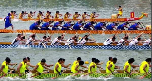 賽龍舟能夠說是端午節(jié)的高潮。龍舟長10米多,以龍頭和龍尾作裝飾,船身還特意雕上麟狀花紋,唯妙唯肖;每只龍舟可容納20至22人,二人并肩而坐,在船首的鼓手和船尾的舵手引領(lǐng)下,以及圍觀人群的吶喊聲中劃向終點(diǎn)。