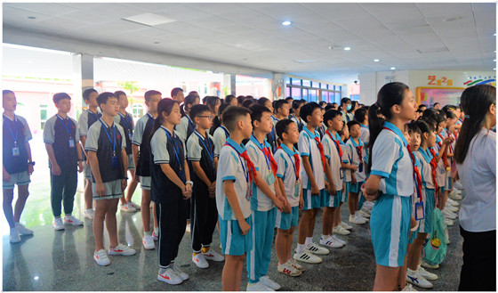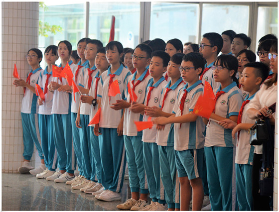 上午7點(diǎn),師生齊聚學(xué)校大堂。一首《沒有共產(chǎn)黨就沒有新中國》助熱現(xiàn)場氣氛。老師領(lǐng)唱,學(xué)生跟唱,全場齊唱。昂揚(yáng)的旋律、蓬勃的精神、自信的擊掌,詮釋著這首歌曲的時代精神。