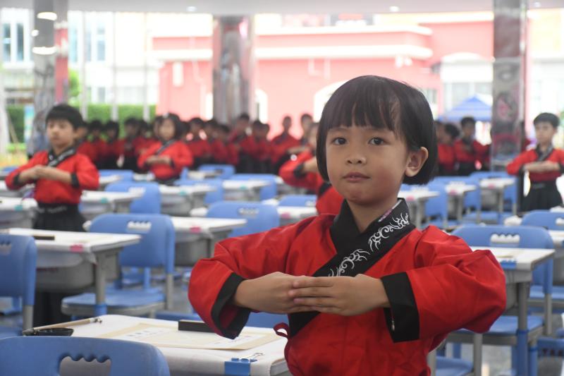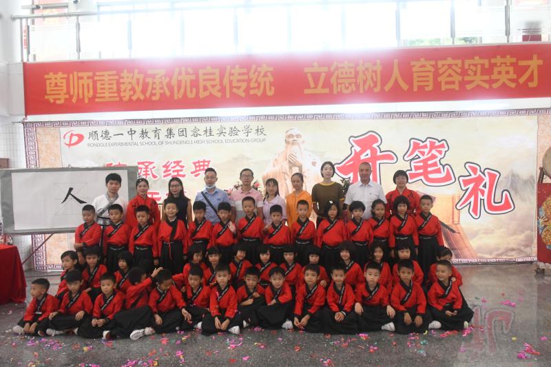 9月28日,一個(gè)莊嚴(yán)恢弘的主席臺(tái)搭建在大堂正中央,兩邊屏風(fēng)環(huán)繞,禮、儀、孝、悌、忠、信、廉、恥的條幅點(diǎn)綴其中。順德一中教育集團(tuán)容桂實(shí)驗(yàn)學(xué)校一年級(jí)新生“開筆禮”儀式,就這樣成功地?fù)屨剂藢W(xué)校頭條。穿戴整齊的漢服萌娃們,跟隨級(jí)長(zhǎng)譚淑儀老師的引領(lǐng),跟隨班主任老師的腳步,踏著古詩(shī)韻律,合掌緩緩進(jìn)入會(huì)場(chǎng),拉開了活動(dòng)的序幕。嘉賓席上,許勇輝先生校長(zhǎng)、德育處李福古副主任等行政領(lǐng)導(dǎo)與一年級(jí)的家長(zhǎng)朋友們,共同見證了這一神圣的時(shí)刻,現(xiàn)場(chǎng)響起一片經(jīng)久不息的贊嘆聲和掌聲。