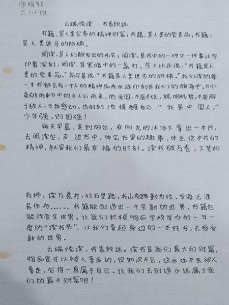 恰逢今天是五、六年級(jí)學(xué)生返校,于是本次活動(dòng)分線下和線上釘釘直播兩部分進(jìn)行。首先,由龍家怡老師向五、六年級(jí)全體師生介紹本次活動(dòng)的意義和介紹讀書節(jié)啟動(dòng)儀式活動(dòng)流程。其次,由葉麗燕副校長(zhǎng)詳細(xì)解讀本學(xué)期讀書節(jié)活動(dòng)方案。然后,學(xué)生們觀看讀書節(jié)啟動(dòng)儀式視頻并撰寫觀后感。一到四年級(jí)的讀書節(jié)啟動(dòng)儀式在釘釘班群上也同時(shí)進(jìn)行。班主任通過(guò)直播向?qū)W生、家長(zhǎng)介紹了本次云端讀書節(jié)活動(dòng),對(duì)學(xué)生的閱讀方法進(jìn)行指導(dǎo)后,觀看讀書節(jié)啟動(dòng)儀式視頻。視頻中,龍江鎮(zhèn)教育局教研專干陳金梅、龍江鎮(zhèn)教育局德育專干和專職責(zé)任督學(xué)劉自力、李耀宗校長(zhǎng)、各行政干部、骨干教師代表、家長(zhǎng)和學(xué)生代表通過(guò)引用關(guān)于“讀書”的名人名言,號(hào)召全體師生多讀書,讀好書,積極參與到讀書節(jié)的各項(xiàng)活動(dòng)中去。在看完了讀書節(jié)啟動(dòng)儀式視頻后,同學(xué)和家長(zhǎng)紛紛表示:視頻拍得太好了,讓人深深陶醉在書香中。六(4)班彭誠(chéng)真同學(xué)在觀后感里面寫到:書籍,可以滋養(yǎng)我們的靈魂。讓我們與書相伴,幸福成長(zhǎng)。二(6)班劉雅婷家長(zhǎng)說(shuō):為華東小學(xué)的讀書節(jié)點(diǎn)贊!讓讀書成為一種時(shí)尚,讓學(xué)習(xí)成為一種習(xí)慣。讀萬(wàn)卷書,行萬(wàn)里路!