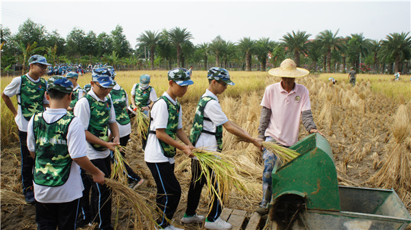 活動(dòng)包括收割稻谷、扎稻草人、心肺復(fù)蘇安全教育、田園野炊生存活動(dòng)、集體游戲等多個(gè)精彩環(huán)節(jié)。最令人難忘的,無疑是本次研學(xué)課程的“重頭戲”――收割稻谷。在導(dǎo)師講解了收割稻谷的注意事項(xiàng)、展示收割的技巧后,同學(xué)們都躍躍欲試。挽起褲腿,拿起鐮刀,彎下身子,割下一株株金黃的稻子,然后到脫粒機(jī)前進(jìn)行脫粒……看著金燦燦的稻谷在谷倉里跳動(dòng),同學(xué)們顯得格外興奮,體驗(yàn)到了豐收的喜悅,忘了汗水和泥土帶來的酸痛。中午時(shí)分,同學(xué)們又開始了田園野炊活動(dòng),只見同學(xué)們分工合作,洗菜、切菜、炒菜、做飯……忙得不亦樂乎,最終吃上了自己做的午餐,這一餐不僅特別美味,還深切體會(huì)到了父母常年做飯的艱辛,懂得了增強(qiáng)生活自理能力的重要性。