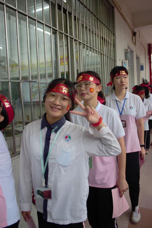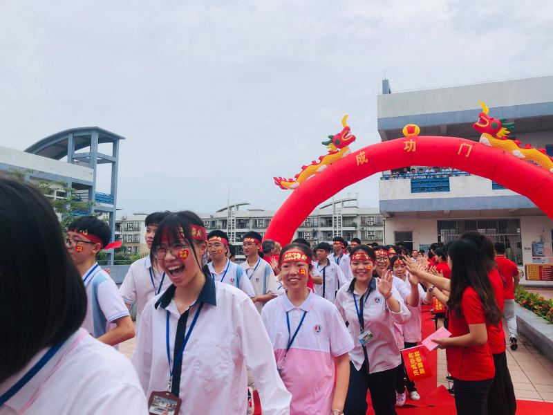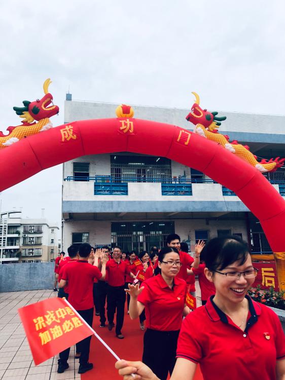 瞬時(shí),同學(xué)們那渴望而又激動(dòng)的眼神聚焦于“成功門”,仿佛那就是心之所盼的未來!各班的領(lǐng)隊(duì)同學(xué)都默默地緊握班旗的旗桿,在班主任的帶領(lǐng)下,同學(xué)們整理好額上的紅絲帶,邊氣勢(shì)如虹地高喊口號(hào)邊有序地走過“成功門”?!俺晒﹂T”兩側(cè)早有初三級(jí)的科任老師列隊(duì)靜候著,他們?yōu)槌跞龑W(xué)子搖旗吶喊,擊掌壯行,為這莊嚴(yán)的場(chǎng)面增添了一份溫情!