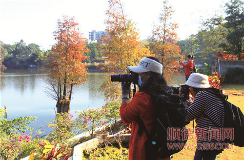 游客和攝影愛好者在仙泉酒店對開湖邊拍攝與欣賞水杉美景。